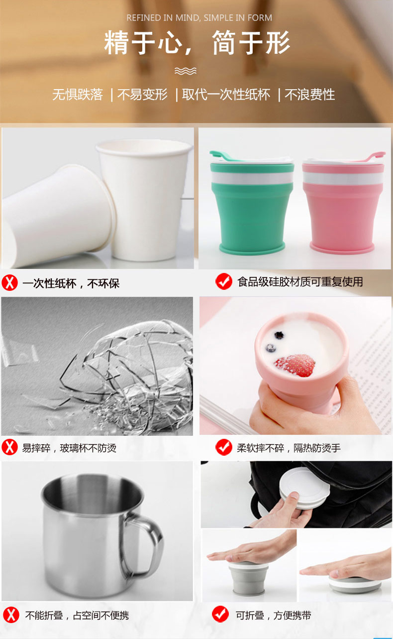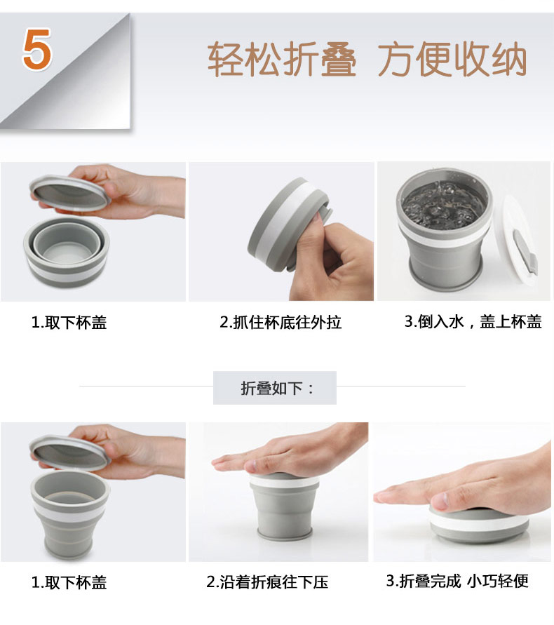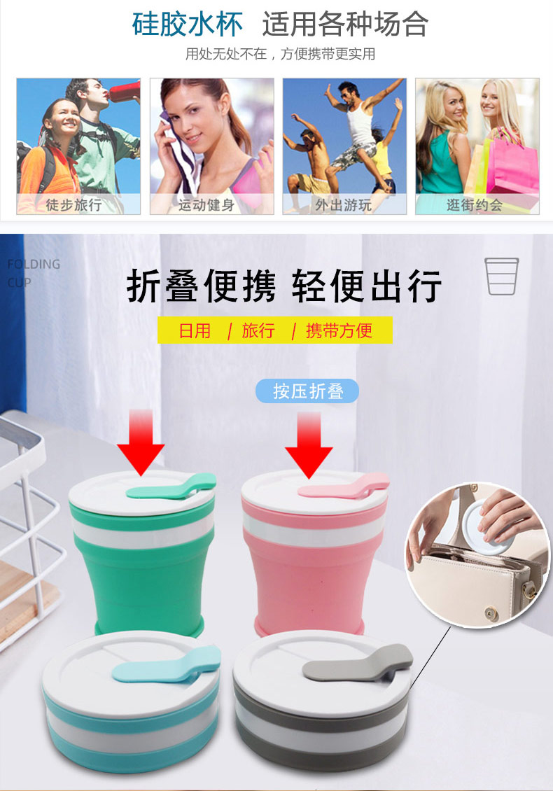 折疊式硅膠水杯成為運動以及郊游的便攜物品之一,水喝完后直接折疊放入口袋減小儲物空間替代了對水壺和瓶裝礦泉水的不足, 完全顛覆了消費者對硅膠折疊水杯的看法,硅膠折疊杯是一種攜帶方便、使用衛(wèi)生、具有雙層杯壁的折疊杯。外壁的兩個相鄰段通過螺紋連接,內壁的兩個相鄰段為錐形配合,可上下移動。通過外壁螺紋旋轉驅動內壁上下展開,實現(xiàn)杯形折疊和拉伸動能。